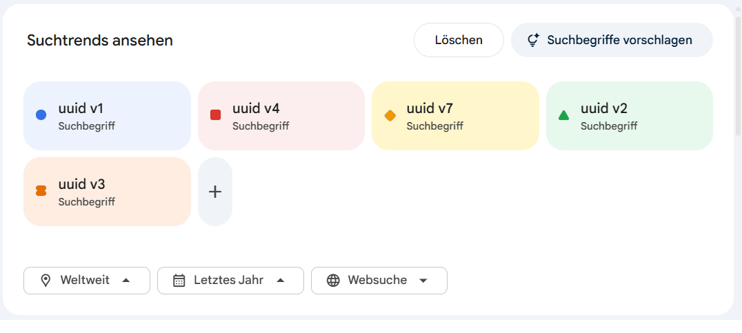 Note: UUID v5 is not included in the Google Trends comparison above, as its search interest is too low to be meaningfully compared to v1, v4 and v7.