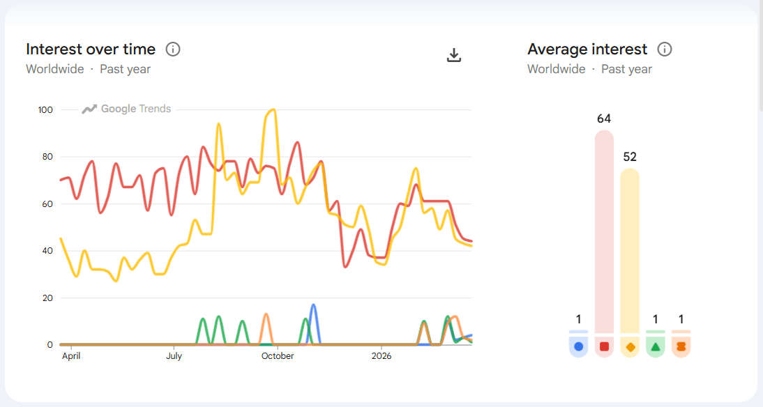 Looking at the data, UUID v4 leads with an average interest of 64, closely followed by the newcomer UUID v7 at 52 ➡️ a clear sign of rapid adoption since its standardization in 2024. UUID v1 and v2 show minimal interest. UUID v5 was excluded from the chart as its search volume is negligible compared to the others.