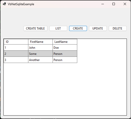 VB.NET SQLite example project – WinForms app with DataGridView and CRUD buttons